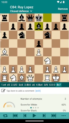 A simple and efficient method to memorize variations of openings in your repertoire. You can train either white’s moves or black’s moves only or both. Optionally, you can train all variations at once. The trainer chooses opponent’s moves randomly from your opening repertoire. Chess Opener tracks your progress and shows your stats.