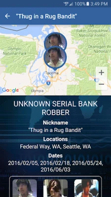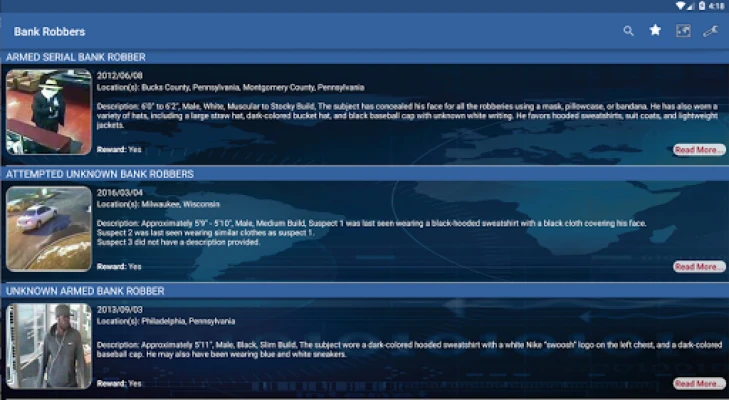 This app allows users to view information about unknown bank robbers sought by the FBI. Only bank robbers who have been uploaded to bankrobbers.fbi.gov will be displayed in this app. Not every bank robbery that occurs nationwide will be shown in this app. Users can enable alerts through the app that will inform them when a bank robbery has occurred near their location. Users can also submit tips using the app.