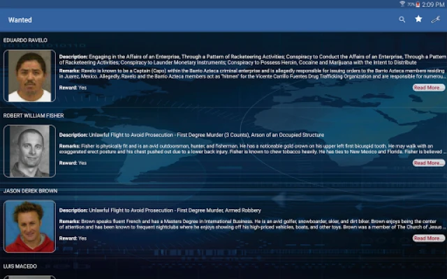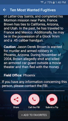 After downloading the app, scroll through the various summaries and tap “Read More” for the full profile. Each profile includes a map showing the local field office working the case, a link to the poster on the FBI.gov website, and descriptive details on the individual wanted or missing. Tap any image to enlarge the photo. Use the button at the bottom of the page to add the profile to your bookmarks page for future reference.