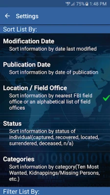 You can access the settings page by going to the home screen and tapping the wrench icon on Android devices or the handcuffs icon on Apple devices. On the settings page, you can choose how you would like to filter and display information in the app. For example, you can sort profiles according to the following categories: Case of the Week, Ten Most Wanted, Fugitives, Terrorism, Kidnappings/Missing Persons, Seeking Information, Parental Kidnappings, Known Bank Robbers, Endangered Child Alert Program, and Violent Criminal Apprehension Program. You can also organize information by FBI field office, publication or modification date, and status (captured, deceased, located, etc.).