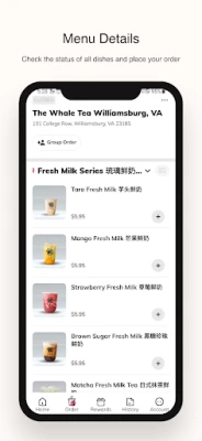 Order ahead and get your food without the wait! Menu Details Check the status of all dishes and place your order. My Orders Track your Orders and get real-time notifications your order is ready! Gallery Snap and Share your The Whale Tea Moments with others. My Account Check your Reward Balance, Order History and more.